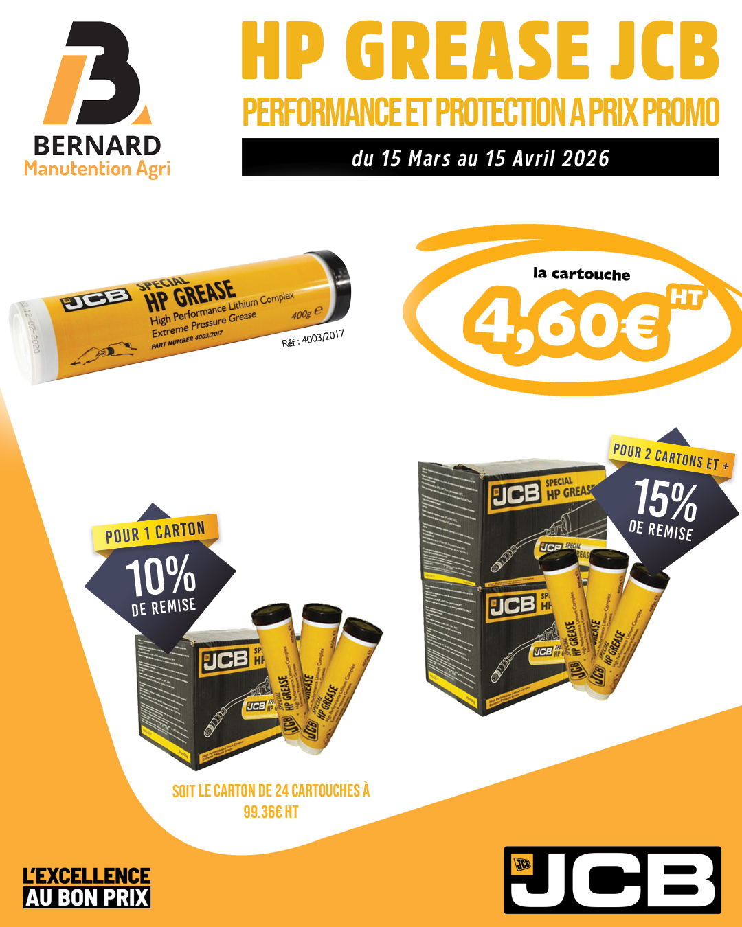 Pour assurer la longévité et les performances de vos machines agricoles et de manutention, le graissage régulier est indispensable. Afin d’accompagner les professionnels dans l’entretien de leur matériel, Bernard Manutention Agri propose actuellement une offre promotionnelle sur la graisse JCB HP GREASE.